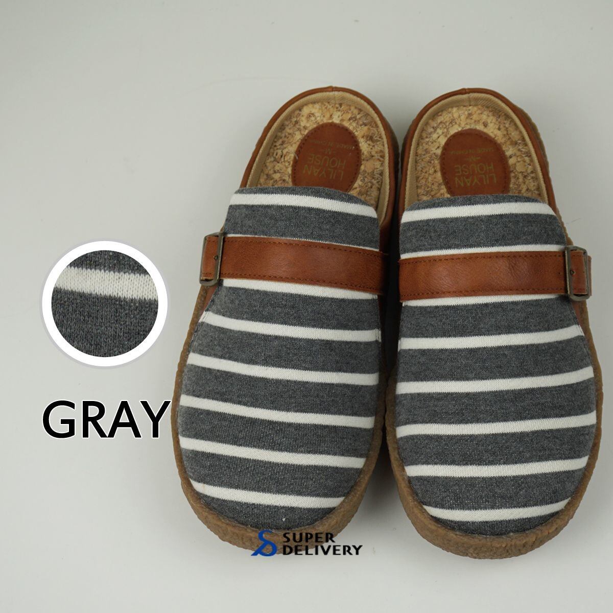 ◆生地の素材感と中敷きのコルクプリントが爽やかな足元を演出。